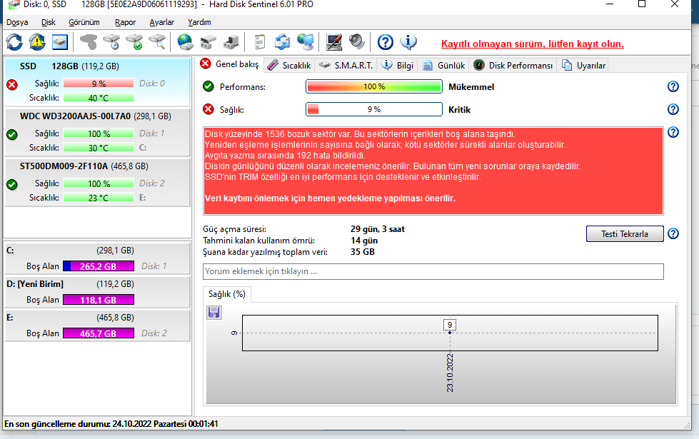 - %40 altı: disk ömrünün sonuna gelmiştir