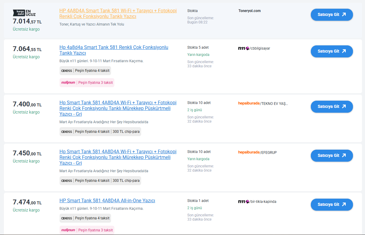 Ürün Bim’de 7500 TL’den satışa sunulmuş. Ben de dedim ki acaba başka yerde daha uygun fiyata bulabilir miyim. Biraz araştırdım ve sizler için en uygun fiyata sahip 5 satıcıyı ekran görüntüsü aldım.