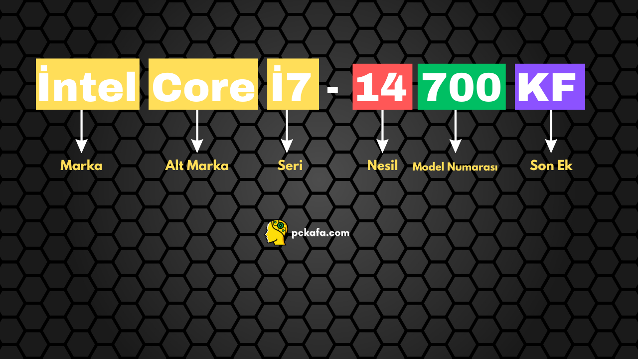 İntel işlemci isimlendirme formatı : [Marka] [Marka Değiştiricisi] [Nesil] [Model Numarası] [Son Ek Harf]