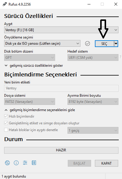 Aynı işlemi biraz daha detaylı olan Rufus ile de yapabilirsiniz.