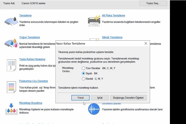 Bu sorun bu marka yazıcılarda da sıklıkla karşılaşılmaktadır. Canon kafa temizleme işlemi için aşağıdaki adımları takip edebilirsiniz.